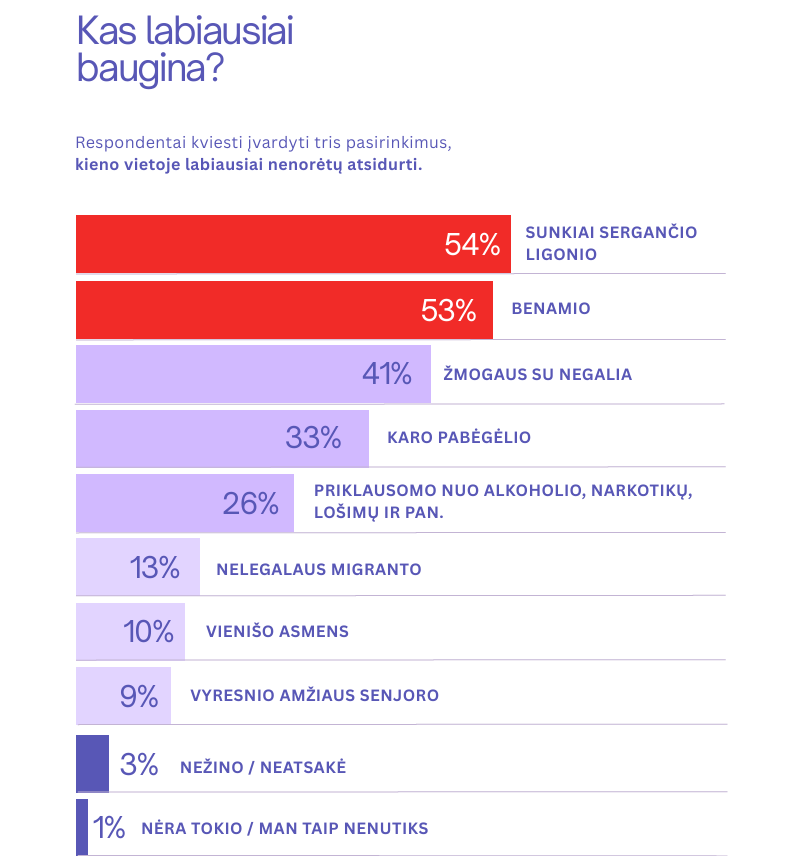 Tyrimo duomenimis, keturis iš dešimties respondentų (41%) labiausiai nenorėtų atsidurti žmogaus su negalia vietoje, kas trečias Lietuvos gyventojas (33%) bijo tapti karo pabėgėliu, daugiau nei kas penktas (26%) – priklausomu nuo psichoaktyvių medžiagų, lošimo ar pan.