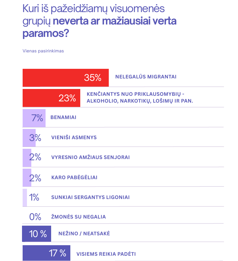 Paklausti, kam kada nors skyrė paramą, po 26 % respondentų minėjo rėmę ligonius ir karo pabėgėlius, 19 % senjorus, po 17 % – benamius ir žmones su negalia, 12 % vienišus asmenis. Pagalbai kenčiantiems nuo priklausomybių paramą yra skyrę 5 %., o nelegaliems migrantams – vos 1 %. Niekam paramos nėra skyręs beveik kas ketvirtas Lietuvos gyventojas (23 %).