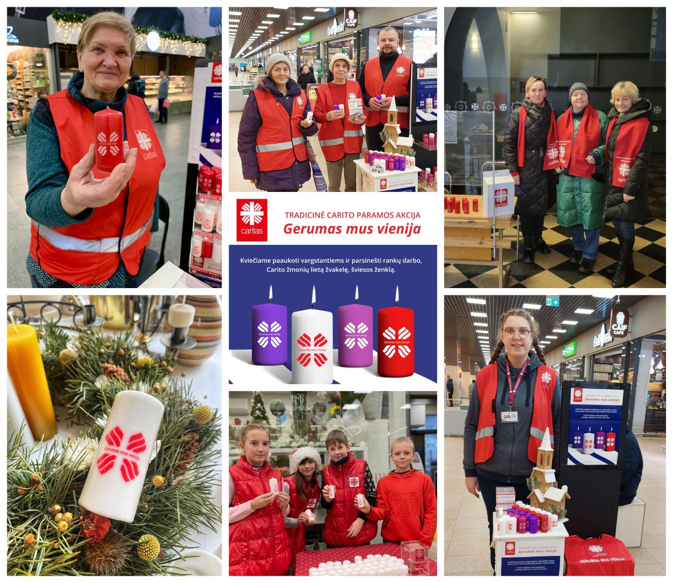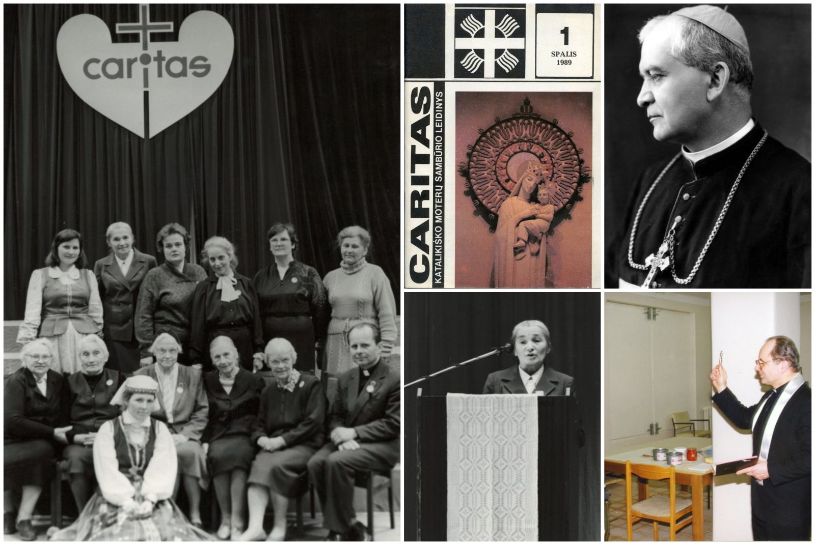 Archyvinėse nuotraukose (iš dešinės į lairę): viršuje - Carito Lietuvoje globėjas pal. Jurgis Matulaitis, žemiau - pirmasis atkurtojo Carito dvasios tėvas, dabar - kardinolas Sigitas Tamkevičius, viršuje - pirmasis žurnalo "Caritas" numeris, žemiau – pirmajame moterų katalikų sambūrio Caritas suvažiavime pasisako viena iš Carito atkūrimo iniciatorių ses. Albina Pajarskaitė. Kirėje – Carito Lietuvoje atkūrimo iniciatyvinės grupės nariai.